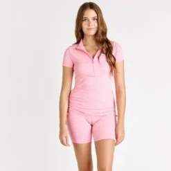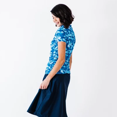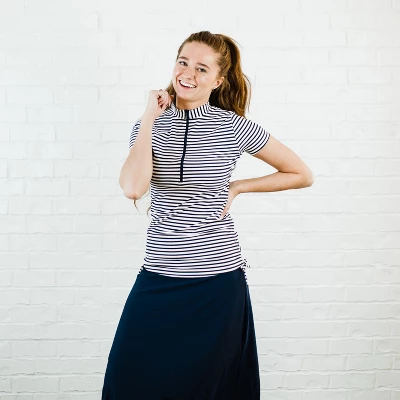 Discover the Half-zip Adele Swim Top, your new go-to for a day at the beach or by the pool. This tight-fit top features a modern mock neckline, short sleeves, and half-zip closure with a tab for adjustable comfort. Designed to be worn over your favorite swim bra, it offers flexibility and style. The side ruching not only adds a chic touch but also provides a flattering cinched look. Made from 82% nylon and 18% spandex, this top is quick to dry and comes with UPF 50+ sun protection. Effortlessly pair this top with the swim bottom of your choice, thanks to our mix & match collection.