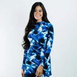 The Jenna Swim Tunic is a long sleeved swim tunic that features a raised collar and a slightly looser fit for easy and comfortable wear all day long! This tunic is long enough to cover the rear and is perfect for all kinds of activities! Pair it with your favorite swim bottoms to complete the look.