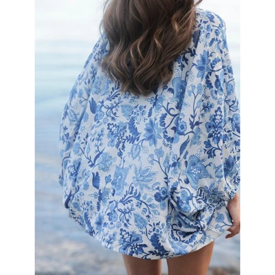 Create a chic summer look with Shiraleah’s Capri Puff Sleeve Cover-Up. This open front cover up comes in white with blue floral all over print. It the perfect addition to your summer outfit. Pair it with jeans and a tank top, layer over a dress or wear as a swim cover-up. Made from viscose material this is a light and cool piece to wear on those hot summer days. The Capri puff sleeve duster has a romantic, feminine feel and will elevate any outfit to stylishly chic. It will sure to become a favorite of yours this summer. Pair with other items from Shiraleah to complete your look!