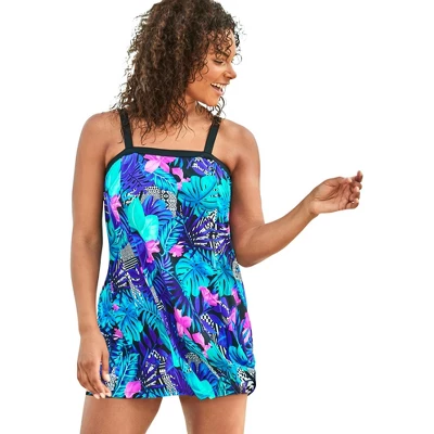Make a splash with this elegant squareneck silhouette, complete with soft cups and adjustable straps. Front power-mesh lining for tummy control. Swing silhouette. Fully lined.