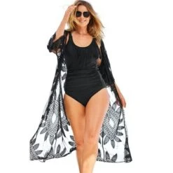 Dress up your poolside look with this lovely coverup complete with wide elbow sleeves for a hint of drama.
