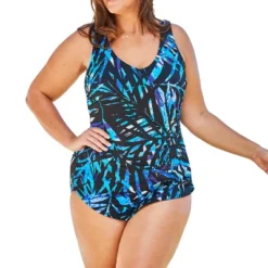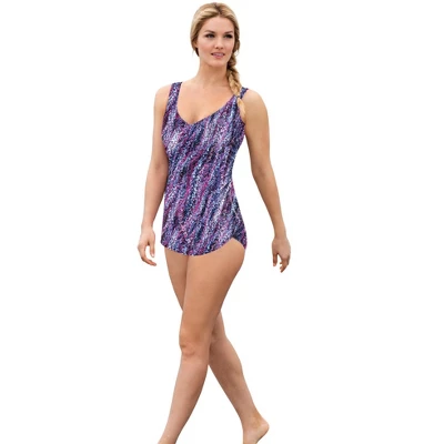This swim tank is draped with a V-neck rounded hem, giving way to a feminine flair. Complete with a soft-cup shelf bra and a plush underband. Front power-mesh lining for tummy control. Wide straps for support. Fully lined.