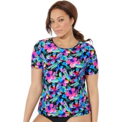 We have comfort and coverage down to a tee! This chlorine resistant swim tee has an easy, relaxed silhouette and is made with no-fade fabric designed to retain its fit and resist bagging. Available in a beautiful assortment of brightly colored prints to boost your mood. Wear over your favorite swimsuit or swim bra and enjoy every moment in the sun!