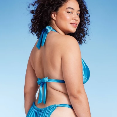Triangle halter bikini top from Wild Fable⢠in a solid hue. Made from soft fabric with spandex for stretchy comfort in and out of the water. Front knot details add a chic touch. Removable cups offer customizable coverage. Back and behind-neck ties provide a stay-put fit.
