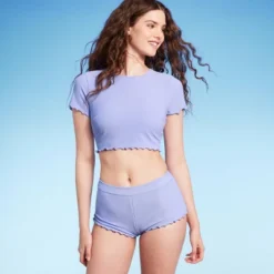 Boyshorts bikini bottom from Wild Fable⢠with ribbed texture and ruffle accents. Made of recycled polyester fabric with added spandex for comfortable wear. Tailored in a mid-rise silhouette. Pull-on style completes the look with easy slip-on and take-off.