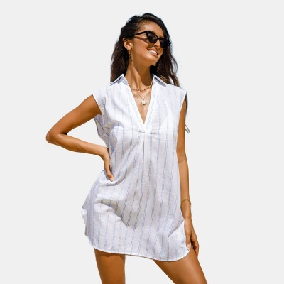 Effortlessly stylish, this Striped Split Neck Cover-Up Dress features a chic split neck and a playful striped pattern, making it the perfect piece to slip on over your swimwear, ensuring you stay fashion-forward and beach-ready all day long.Product code: CAA07B3F015CCModel Wearing Size: XSHeight: 5′ 5” in165 cmBust: 30 in77 cmWaist: 24 in61 cmHips: 32 in 81 cm
