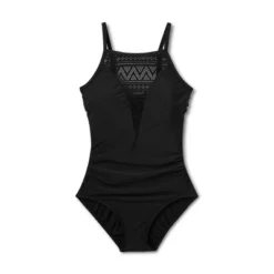 Look no further for the perfect swimsuit, think elegant meets chic in this jaw dropping one piece. The high neckline of this swimsuit has a subtle and alluring crochet inset front and center to create a ornate and contemporary look. This one piece swimsuit is complete with removable cups and adjustable straps for a customizable fit and full modern bottom coverage.