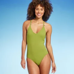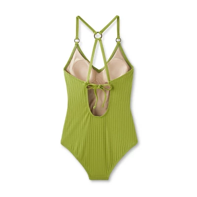 Elevate your swimwear collection with this Wide Ribbed Ring Medium Coverage One-Piece Swimsuit from Kona Sol™. This one-piece swimsuit is designed to offer medium coverage. It features a green rib-textured construction with metal ring accents on the straps for a chic touch of shine. The crisscross back with a tie closure makes it easy to find just the right fit. Plus, the sewn-in cups offer confident overage.